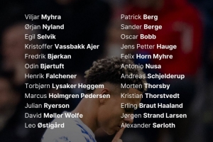 中前场:帕特里克-伯格(博德闪耀)、桑德-博格(富勒姆)、鲍勃(富勒姆)、海于格(博德闪耀)、迈尔(布兰)、努萨(莱比锡)、谢尔德鲁普(本菲卡)、托斯比(克雷莫内塞)、托尔斯特韦特(萨索洛)、哈兰德(曼城)、拉尔森(水晶宫)、瑟尔洛特(马竞)