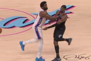 恩比德不慎掐到阿德巴约喉咙 裁判吹罚为普通犯规
