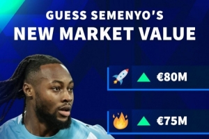 体育资讯3月6日讯 德国转会市场预热曼城前锋塞梅尼奥的最新身价,他的身价最高可能达到8000万欧,最低6000万欧。